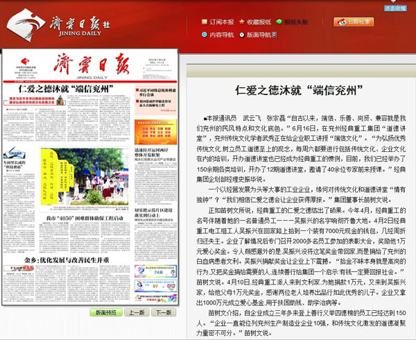 苗樹文介紹,自企業成立三年多來登上善行義舉四德榜的員工已經達到150人。“企業一直能位列兗州生產制造業企業10強,和傳統文化激發的道德凝聚力量密不可分。”苗樹文說。