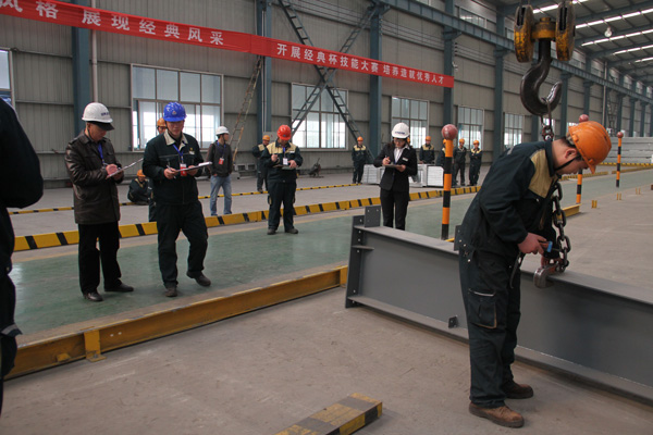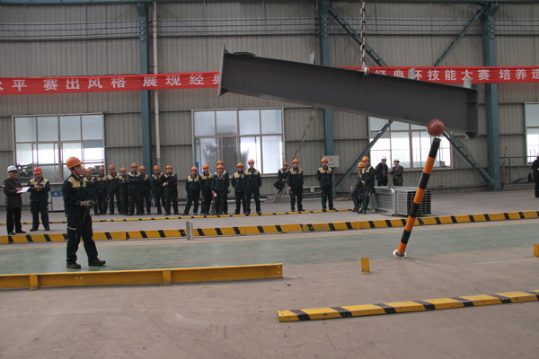 比賽在集團公司輕鋼車間進行。比賽活動將理論學習和實踐操作相結合,就安全知識的理解、吊車性能的掌握、實際吊裝操作三項內容進行了競賽。實際操作中設計了起吊鋼構件撞球動作,要求在規定的時間內準確完成技術動作。經過緊張而激烈的比賽和成績綜合評比,烤梁班組的馮勇獲得起重機技能比賽第一名,門焊機班組李寶光、烤梁班組的張世凱分別獲得起重機技能比賽二名;組立機班組黃元德、拼裝班組孔祥文、史保健分別獲得起重機技能比賽第三名,并授予“青年崗位技術能手”榮譽稱號;姜勝利顧凱李小明李慶分別獲得起重機技能比賽優秀獎,并授予“技能操作優勝者”榮譽稱號。