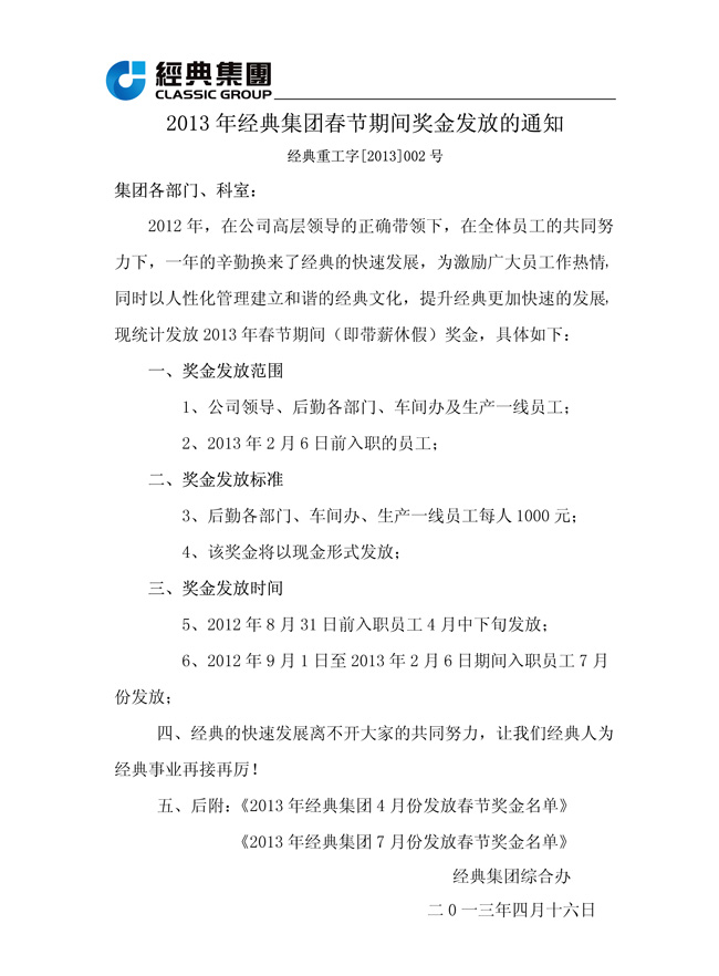 2013年經(jīng)典集團春節(jié)期間獎金發(fā)放的通知