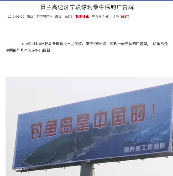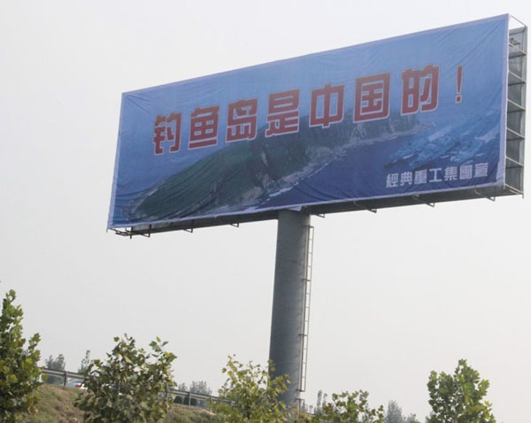 近一段時期以來日本推出了所謂的“購島”無恥行徑,刺激了國人的神經,我們集團作為中華民族大家庭的一員,有責任也有義務保衛(wèi)我們祖國領土的完整,和不容侵犯,為此集團領導代表集團全體員工通過各種方式彰示了我們的愛國熱情,并付諸于實際行動斥巨資在日蘭高速濟寧段制作了高炮廣告“釣魚島是中國的”以顯示我們保釣之決心。