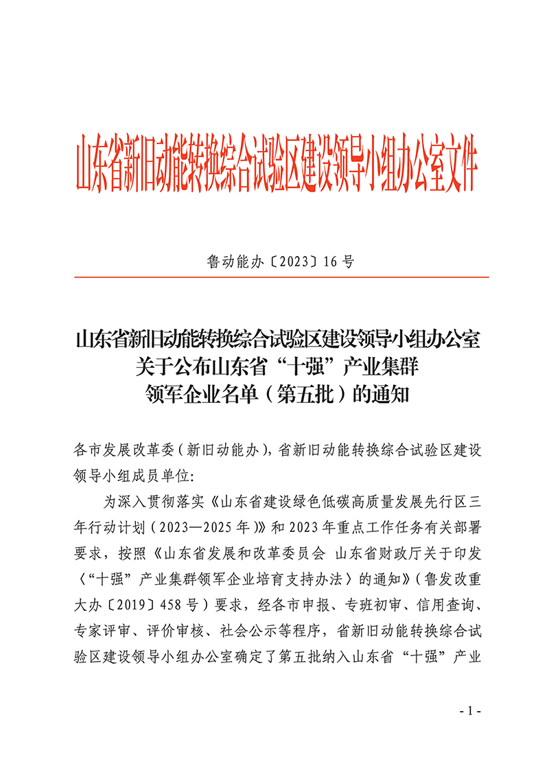 6月19日,山東省新舊動(dòng)能轉(zhuǎn)換綜合試驗(yàn)區(qū)建設(shè)領(lǐng)導(dǎo)小組辦公室發(fā)布了《關(guān)于公布山東省“十強(qiáng)”產(chǎn)業(yè)集群領(lǐng)軍企業(yè)名單(第五批)的通知》(魯動(dòng)能辦【2023】16號),山東經(jīng)典重工集團(tuán)股份有限公司成功入選山東省“十強(qiáng)“產(chǎn)業(yè)集群領(lǐng)軍企業(yè)名單。